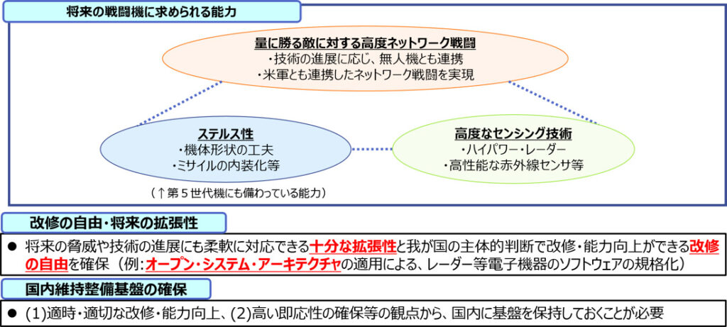 - ウェポンベイ(兵器庫) ステルス性を保つためにミサイルを機内に隠しますが、日本が開発中の「極超音速誘導弾」のような大型ミサイルも入るサイズが要求されています。