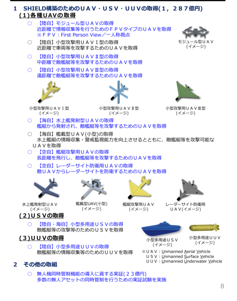 まず一番驚いたのがこれです。 「艦艇から発射され、敵艦艇等を攻撃するためのUAV」。