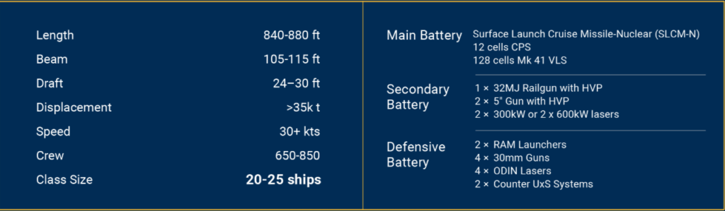 特徴: 従来の艦艇をはるかに凌ぐ威力を持ち、極超音速ミサイルなどの最新兵器を搭載すると説明されています。